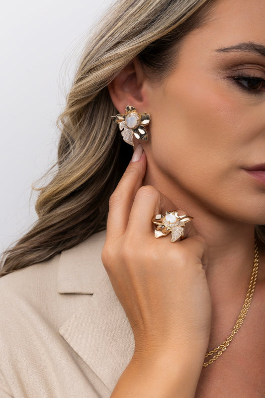 Conjunto Anel e Brinco Flor Zircônia Madrepérola Banho Ouro 18k