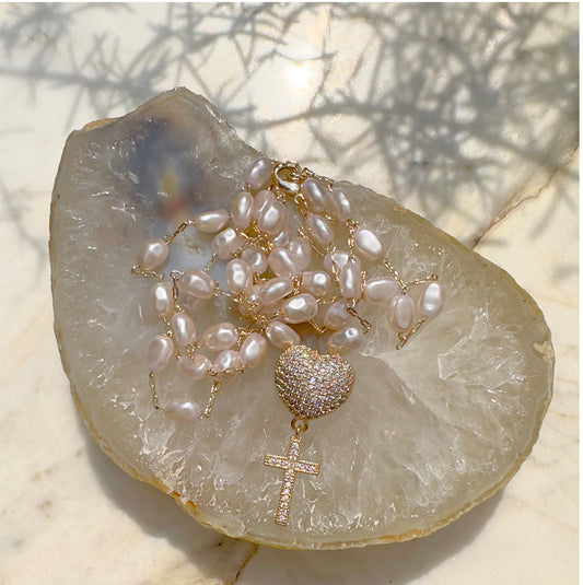 Colar Perola Zircônia Branca Coração Cheio Inteiro Cravejado Pingente Cruz