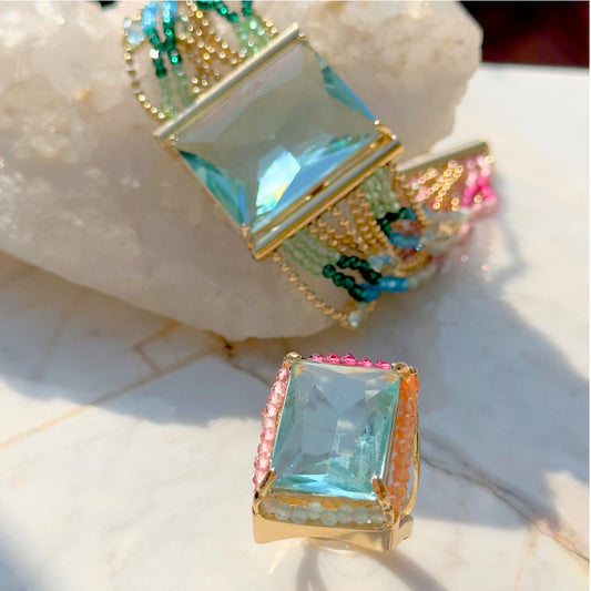 Pulseira Retângulo Cristal Topázio Azul 20cm Banho de Ouro 18K
